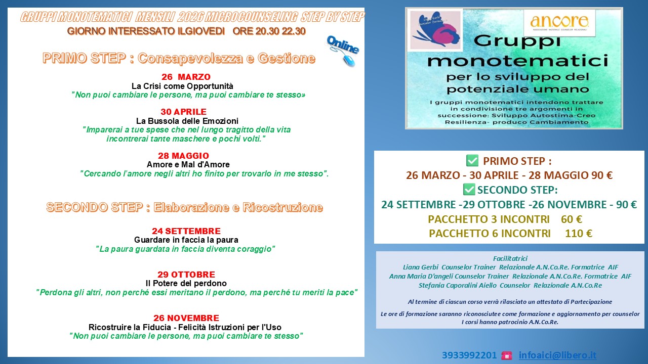 - Le ore di formazione saranno riconosciute come aggiornamento per counselor